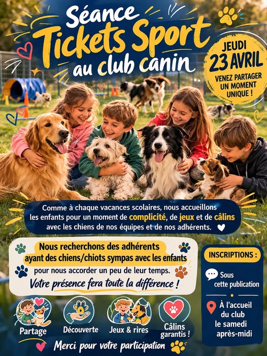 Cette activité, organisée par la municipalité et le centre des sports aura lieu ce jeudi de 14h à 15h30 !!! Appel aux adhérents : N’hésitez pas à venir avec votre chiot/ chien sympa, pour accompagner les enfants et passer un bon moment. A jeudi !