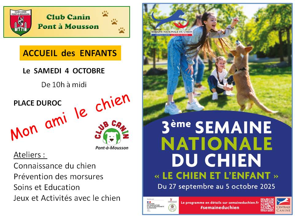 Dans le cadre de la semaine nationale du chien dont le thème est cette année, le chien et l’enfant, le club canin proposera une animation de découverte du chien auprès des enfants sur la place Duroc le samedi 4 octobre. Différents ateliers seront proposés. Venez nombreux avec vos enfants et petits-enfants !