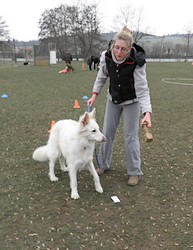 | 11 février 2012 Le froid et le gel ne découragent pas les maîtres motivés! Il a gelé à -17° et une fine couche de neige recouvre encore le sol. Les maîtres sont bien emmitoufflés, bottes et bonnets sont indispensables. Les chiens eux, ont besoin de bouger pour se réchauffer, et la séance est plutôt mouvementée | |