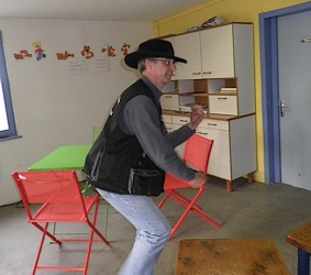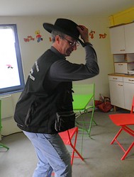 | Durant la pause, c'est la détente pour tous. Pierre a chipé le chapeau de Pascal pour jouer "Aldo", la star! | |