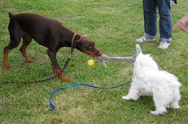 | Tomy aimerait bien être grand comme Driska pour pouvoir attraper la friandise dans la main de sa maîtresse ! | |